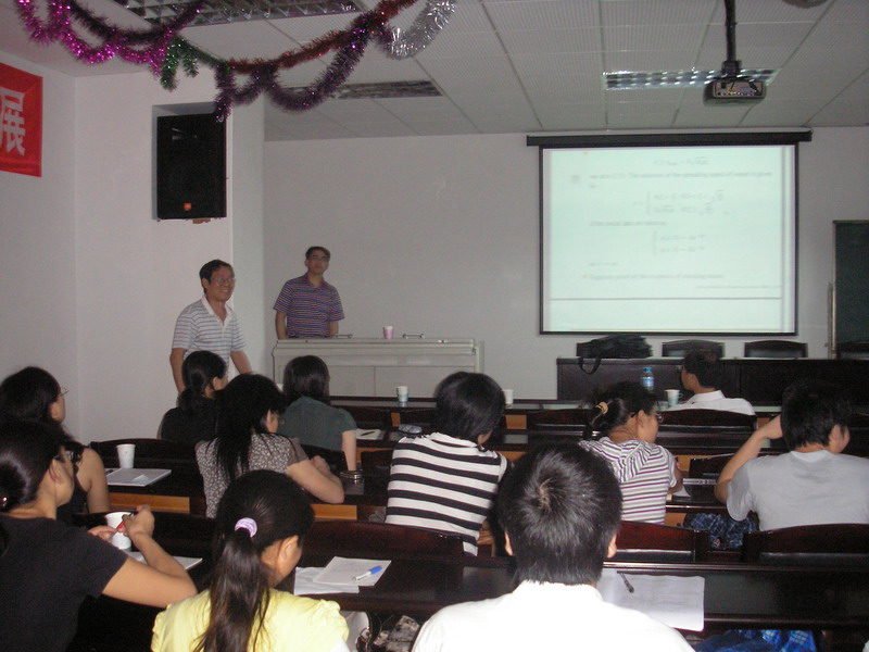 在报告中欧春华教授通过趋向性模型及趋向性填充模型的历史背景、最小波速及波速的确定、行波解存在性的严格证明、数值模拟、讨论五部分详细讲解了研究趋向性填充模型行波解存在性的方法和意义;唐先华教授也通过二阶Hamiltonian系统的变分结构与临界点、具周期性系数的二阶Hamiltonian系统的同宿轨、具非周期性系数的二阶Hamiltonian系统的同宿轨(I)、具非周期性系数的二阶Hamiltonian系统的同宿轨(II)四部分详细讲解了研究二阶Hamiltonian系统的同宿轨的方法和主要结论。报告最后,热情的欧教授和唐教授还对老师和员工提出的问题给出了详细解答。