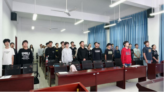 音乐随即响起,由具备丰富领唱经验的邬佳晋同学担任领唱,领唱过程情感饱满、节奏精准,在场员工跟随领唱对“三歌”依次开展合唱,先后演唱国歌、团歌、校歌,合唱过程中声部配合有序,整体氛围庄重。