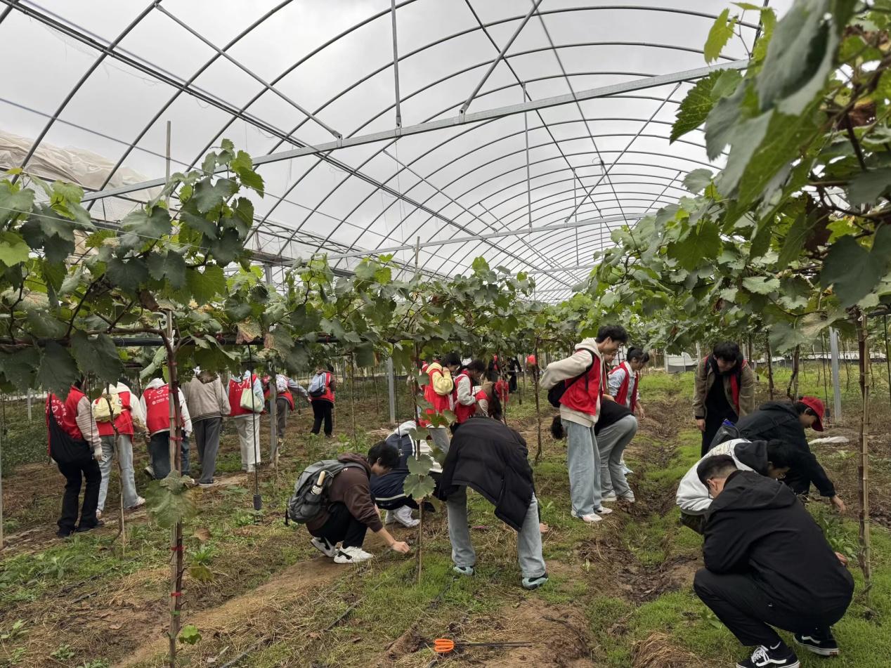 参观结束后,师生们走进清花湾聚葡萄基地,俯身投身田间劳作,手持工具细致清理杂草,逐一捡拾田间白色垃圾,以躬身实干守护田园洁净,用实际行动践行生态理念,在劳作中体悟耕耘不易,在实干中厚植责任担当。两个小时的劳动后,师生们带着满满的劳动收获离开葡萄基地。