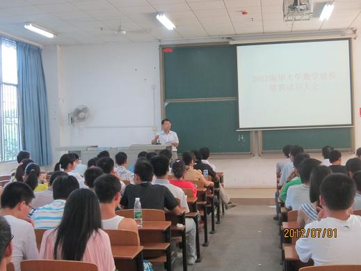 2012年7月1日上午,公司2012年全国老员工数学建模竞赛暑假培训动员会在1教114教室隆重举行。为期34天的培训工作就此拉开了序幕。哈哈体育经理欧阳自根教授、公司党委书记彭建军教授、副经理胡和平副教授,教务处副处长廖基定教授、数学教研室主任廖新元教授和教师代表以及去年参赛和今年校选拔赛获奖的同学(40个队)参加了此次动员会。
