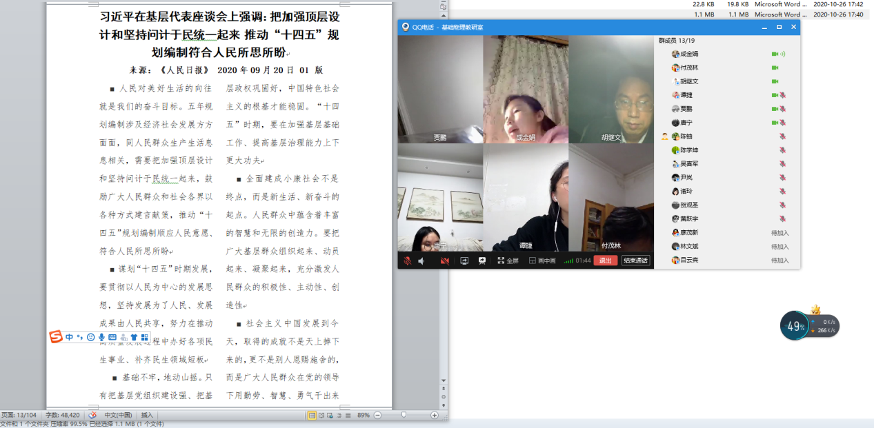 物理教研室党支部:10月31日晚上20:00-21:00物理教研室全体成员各自通过互联网在线上利用QQ语音视频,开展了深入学习习近平重要讲话,把学习贯彻习近平总书记在湖南考察时的重要讲话指示精神当作当前首要政治任务、头等大事和长期任务,把学习贯彻基层代表座谈会精神与贯彻习近平总书记来湘考察调研时的系列重要讲话指示精神结合起来,与习近平总书记关于“十四五”规划编制的一系列重要论述结合起来,注重学习提升,入脑入心、学用结合,真正把习近平总书记的殷切嘱托作为我们统一思想行动、提升本领能力的锐利思想武器。
