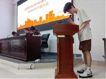 辅导员王佳瑞老师发表了讲话。她主要强调了自评优与优员工的评选工作,鼓励同学们积极参与,展现自己的优秀品质。同时,王老师还提到了即将举办的爱国主义活动,她希望同学们能够踊跃参加,通过实际行动来表达对祖国的热爱之情。在谈及换届工作时,深情寄语同学们,希望大家能够打起精神,站好最后一班岗,在部门留下美好的回忆。