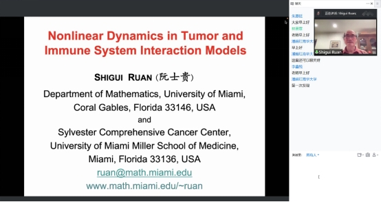 2022年6月19日上午8:30,哈哈体育通过腾讯会议的形式主办了肿瘤与免疫系统相互作用模型中的非线性动力学的学术讲座。该会议由朱惠延教授邀请的专家——美国迈阿密大学数学系终身教授阮士贵教授主讲,由欧阳自根教授主持,参与会议有60余人。该学术活动的目的是牢固确立人才培养在高校工作中的中心地位,着力培养信念执著、品德优良、知识丰富、本领过硬的高素质专门人才和拔尖创新人才。同学们积极热情参加并认真投入该学术讲座中。在这场关于传染病、肿瘤病和免疫系统的报告中,阮教授向我们讲授与学科有关的知识和新的研究进展,促使我们了解生物数学学科和医学领域的前沿知识,掌握最新的研究动态。经过一个小时的精彩演讲,之后参加会议的老师和员工们向阮教授进行提问,阮教授都一一给出了解答,最后该学术讲座在参会人员的感谢与掌声中完美结束。